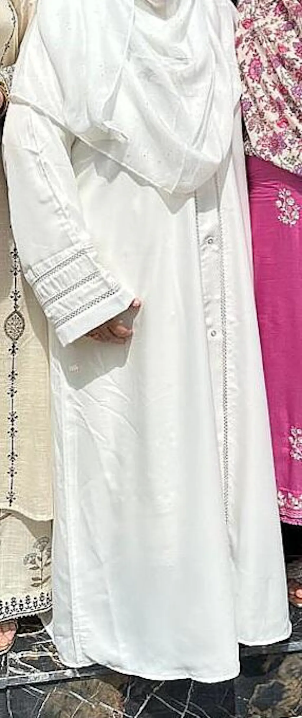 Crafted from premium Nidah fabric, this abaya is designed to bring timeless elegance and everyday comfort together. The smooth flow of the fabric offers a graceful drape, while the intricate lace detailing on the sleeves adds a touch of sophistication.